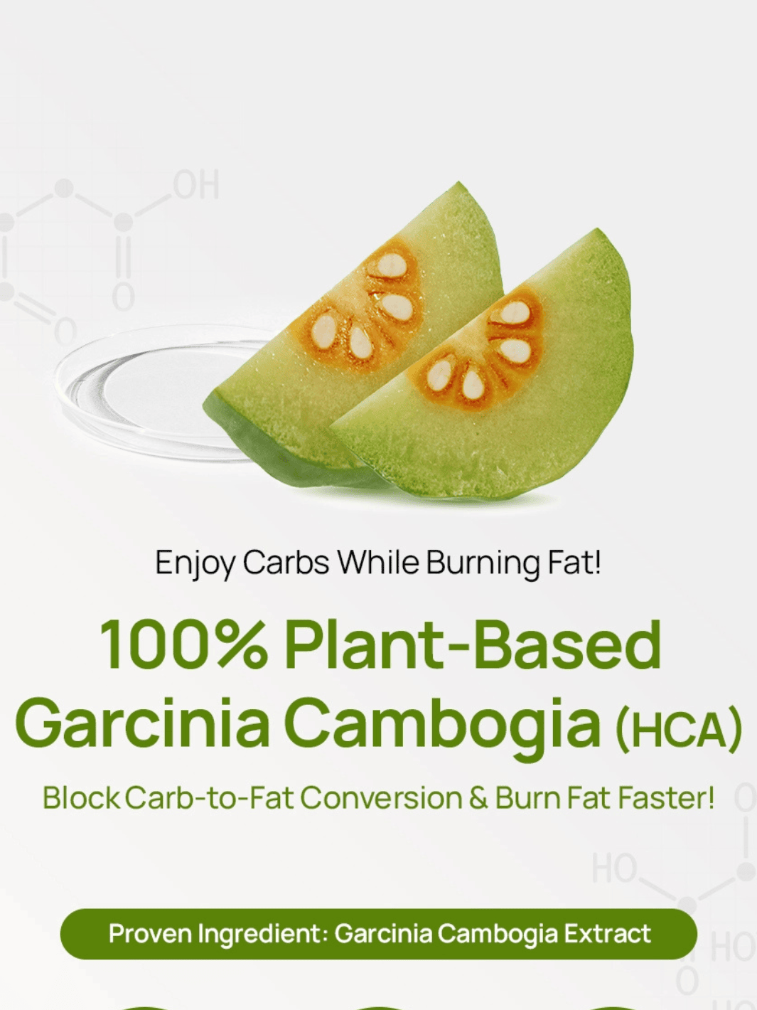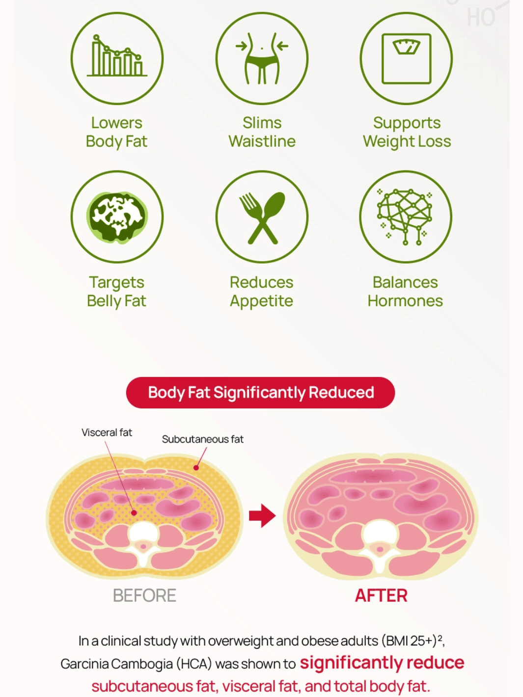 Contains Garcinia Cambogia extract, clinically proven to reduce body fat, waist circumference, weight, and visceral fat while suppressing food intake.